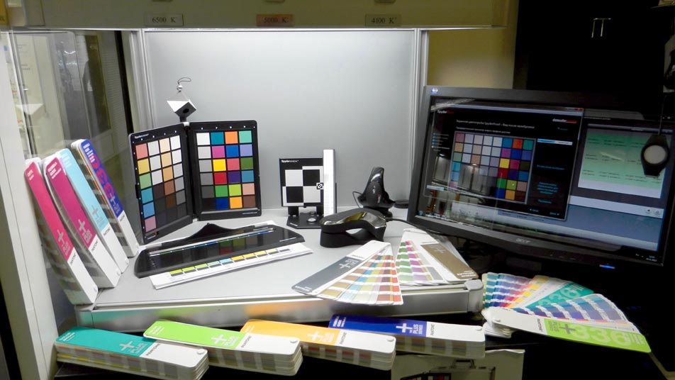 Также на стенде – оборудование конкурирующего производителя, Datacolor, для сравнения и цветовые справочники Pantone.